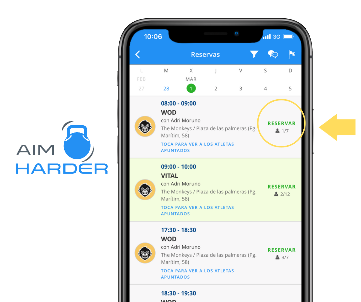 Busca el día y hora que quieras entrenar y clica sobre RESERVAR.